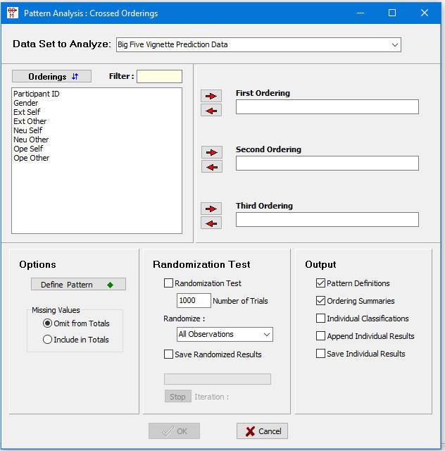 Software Access: The Pattern Analysis -- Crossed Orderings procedure can be found by selecting "Analyses --> Pattern Analysis --> Crossed Orderings" from the Main Menu. The procedure window appears as: