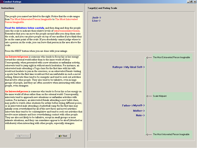 A new scaling procedure included in Idiogrid in which the participant simultaneously rates various targets (usually people) on a continuous scale anchored by adjective terms. The administrator determines the anchors for the scales and can also provide extended definitions of the scale anchors. The data that results from the rating procedure will range in value from -200 to +200. A screenshot of this novel scale can be seen here